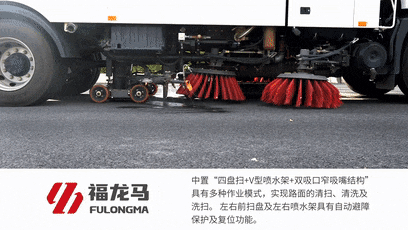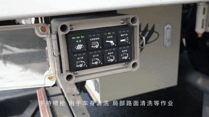 “中置四盘扫+中置V型喷水架+中置双吸口窄吸嘴结构” 具有多种作业模式,实现路面的清扫、清洗及洗扫。采用“显示屏+控制器+CAN总线操作面板”的控制模式,作业启动和作业停止时,驱动电机转速控制、吸嘴升降、扫盘收放、左右喷杆收放等作业装置全由一键控制,操作简便。